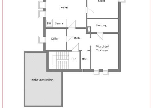 Das Haus ist vollständig unterkellert. Ein großzügiger, beheizter Hobbyraum mit integrierter Sauna sowie zwei weitere Kellerräume bieten reichlich Stauraum oder Platz für individuelle Hobbys. Die separate Waschküche mit Anschlussmöglichkeit für Waschmaschine und Trockner sorgt für praktischen Komfort. Abgerundet wird das Untergeschoss durch den Heizraum mit der Gasheizung.