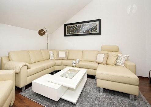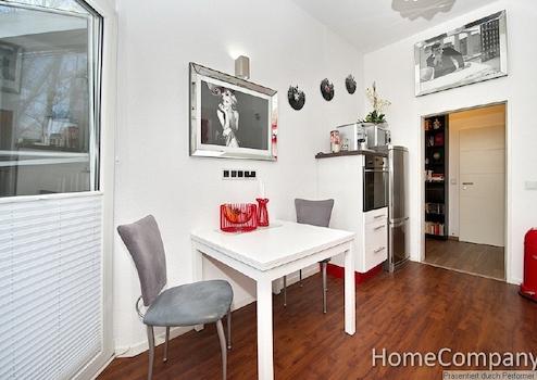 This apartment leaves nothing to be desired! The living area offers a cosy corner sofa with state of the art 3D smart TV, including 3D player, a hi-fi system and a fireplace with bioethanol flame. From the living room and kitchen you can access the rear-facing balcony, which offers a Weber barbecue and a view of the greenery. The bedroom is furnished with a high quality American divan bed and an enormous wardrobe. A smart TV is provided in this room too. The bathroom is extremely luxuriously appointed. The bath features a fitted Raindance shower with safety glass shower enclosure. As well as a WC, there is also a bidet. In the modern fitted kitchen you will find an oven, ceramic hob, large fridge-freezer, automatic coffee machine, microwave, washing machine and a comprehensive range of cooking utensils and tableware. The building’s cellar houses laundry drying rooms and a bicycle cellar. The rent of € 1450 includes all energy costs, running costs, use of the high speed internet connection and reception of around 100 TV channels, of which about 70 are in HD, as well as use of the parking space in front of the building. If desired, a cleaning service can also be arranged. This will be charged according to the work involved. The property owner is responsible for final cleaning at the end of your stay. This will be invoiced according to the work involved, at a rate of € 35 per hour.