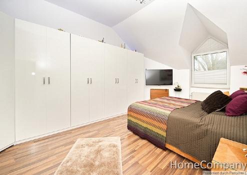 einer HiFi-Anlage und einen Kamin mit Bioethanol-Flamme. Vom Wohnzimmer und Küche gelangen Sie auf den rückwärtigen Balkon mit Weber-Grill und Blick ins Grüne. Das Schlafzimmer verfügt über ein hochwertiges American Boxspringbett und einen riesigen Kleiderschrank. Auch in diesem Zimmer steht Ihnen ein Smart-TV zur Verfügung. Das Bad ist hochwertigst ausgestattet. Die Wanne verfügt über eine fest installierte Raindance-Dusche mit einer Duschabtrennung aus Sicherheitsglas. Neben dem WC ist auch ein Bidet nutzbar. Die Küche ist mit einer modernen Einbauküche mit Backofen, Cerankochzone, großer Kühlgefrierkombination, Kaffeevollautomat, Mikrowelle, Waschmaschine und einer umfangreichen Ausstattung an Kochutensilien und Geschirr versehen. Im Keller befinden sich Trockenräume und ein Fahrradkeller.