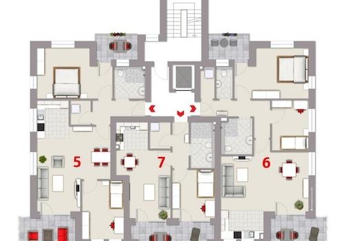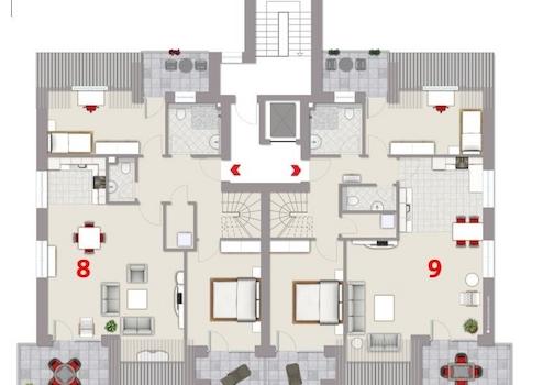 Eine Besonderheit stellt das zweite Obergeschoss in Kombination mit dem Dachgeschoss dar. Dort entstehen zwei Komfortwohnungen. Bei einer Wohnfläche von jeweils ca. 135 m² auf zwei Ebenen bieten wir Ihnen die Möglichkeit, sich bei der Grundrissplanung aktiv zu beteiligen.