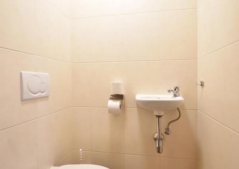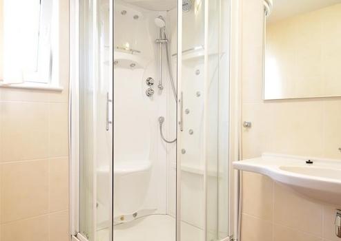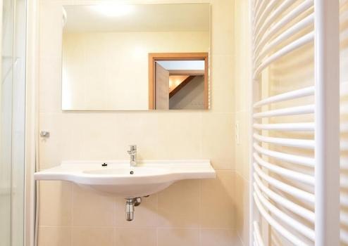 Dieses en-suite Badezimmer ist komfortabel ausgestattet mit einem Waschbecken, einer modernen Duschkabine und einem Design-Heizkörper für angenehme Wärme. Funktional und stilvoll – direkt vom Schlafzimmer aus zugänglich.