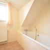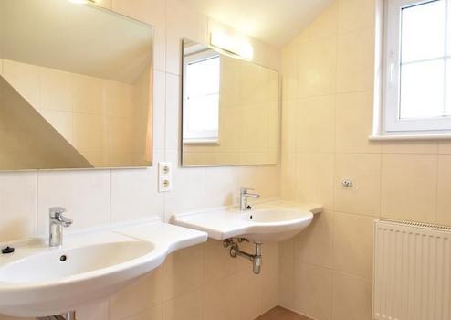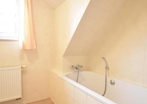 Im Obergeschoss liegt dieses schöne Badezimmer mit einer Badewanne – ideal zum Entspannen. Zwei Waschbecken bieten Komfort für mehrere Gäste, und ein Fenster sorgt für Tageslicht und frische Luft. Eine praktische und gemütliche Wohlfühloase.