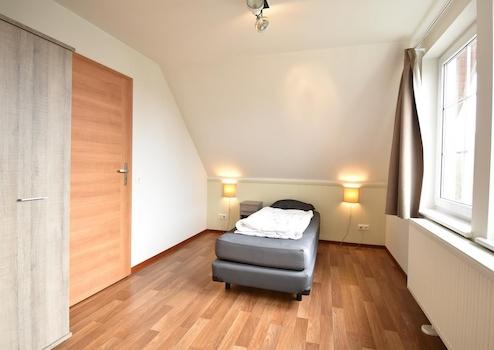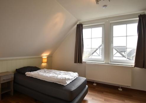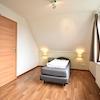 Auch im Obergeschoss befindet sich dieses angenehme Schlafzimmer mit einem gemütlichen Boxspringbett, einem praktischen Kleiderschrank und einem Fenster, das für Licht und frische Luft sorgt. Ideal zum Entspannen nach einem erlebnisreichen Urlaubstag.