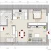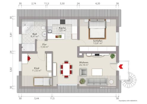 Das Dachgeschoss bietet eine abgeschlossene Wohneinheit (ca. 68qm Wfl.) bestehend aus einem offenen Wohn-/Essbereich mit Küche, zwei Schlafräumen und einem Badezimmer mit Wanne und Dusche. Die Einheit ist über eine Außentreppe (Wendeltreppe) zu erreichen.