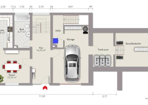 Das Erdgeschoss bietet ein Esszimmer, Küche, Tageslichtbad mit Wanne sowie die Garage inkl. Heizungsraum. Über die Garage gelangt man außerdem in die beiden Kellerräume. Im Obergeschoss befinden sich das Wohnzimmer mit Zugang zur Terrasse, drei Schlafräume und ein weiteres Badezimmer (Rohbau).