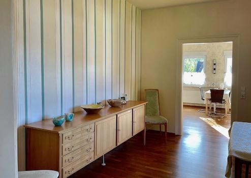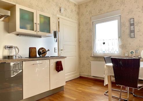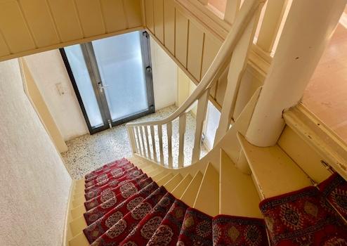Von der Straße gelangt man über mehrere Stufen zum Hauseingang und betritt das originalgetreu erhaltene Treppenhaus. Von hier aus gelangt man in die ca. 80 m² große, renovierungsbedürftige Erdgeschosswohnung. Diese verfügt über eine Küche, ein Wohnzimmer und zwei Schlafzimmer. Die Räume sind wie auch das kleine Badezimmer durch einen Flur erschlossen. Im hinteren Teil dieser Etage befinden sich Heizungsraum und Werkstatt. Das Obergeschoss wurde 2013 neu renoviert und zu einer Wohnung mit ca. 96 m² und offenem Raumkonzept umgestaltet. Im Dachgeschoss befinden sich drei Mansardenzimmern und ein kleines Bad sowie Speicherplatz.