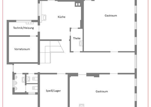 Historischer Gasthof im Erdgeschoss mit Nebenzimmern, getrennte Gastro, Toiletten, Küche, Lager-Räume für Lebensmittel und Gastro-Bedarf.