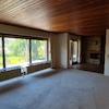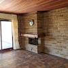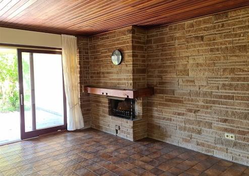 Wohn-Esszimmer mit offenem Kamin und Zugang zur teilweise überdachten Terrasse