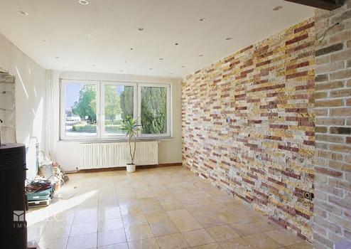 Beim Betreten des Hauses empfängt Sie ein großzügiger Flurbereich, der sowohl im Erdgeschoss als auch im Obergeschoss vorhanden ist. Im Erdgeschoss gelangen Sie linkerhand in das gemütliche Wohnzimmer, das durch eine stilvolle Riemchenwand einen besonderen Akzent erhält. In der kalten Jahreszeit sorgt hier ein Kaminofen für behagliche Momente und wohlige Wärme.