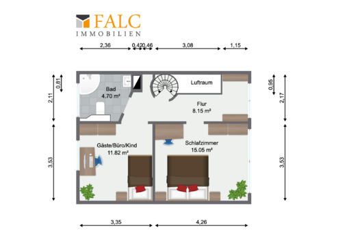 Das Obergeschoss beherbergt zwei Zimmer: ein großzügiges Schlafzimmer und ein weiteres Zimmer, das flexibel als Kinderzimmer, Büro oder Gästezimmer genutzt werden kann. Ein neu gestaltetes Badezimmer mit Dusche rundet das Raumangebot auf dieser Etage ab.