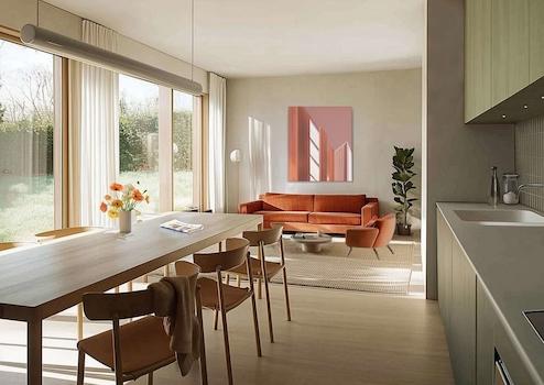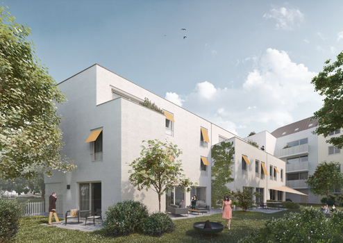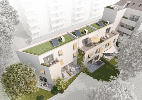 Der Wohn- und Essbereich ist offen gestaltet und öffnet sich über große Terassentüren direkt in den Garten hin. Ein Tiefgaragenstellplatz ist in einem gegenüberliegenden, sich in Planung befindlichen Objekt reserviert, zudem ist im Erdgeschoss ein Parkplatz mir Carsharing-Angebot vorgesehen.