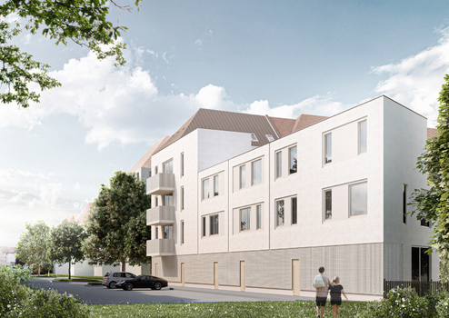 Das Stadthaus wir in Massivbauweise ohne Keller errichtet und dem Effizienzhaus-Standard KfW 55 entsprechen. Die Materialität und Farbgestaltung der Fassade wurde in Abstimmung mit dem Denkmalamt gewählt, damit sich der Neubau harmonisch in das Viertel einfügt.