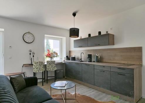 ### Please note the availability date! Bitte das Verfügbarkeitsdatum beachten! ### höbsche möblierte Wohnung in ruhiger Wohnlage in Waldkappel; WLAN; großes Wohnzimmer mit modernen rustikalen Möbeln, Sofa, Esstisch, ...