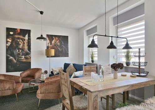 ### Please note the availability date! Bitte das Verfügbarkeitsdatum beachten! ### höbsche möblierte Wohnung in ruhiger Wohnlage in Waldkappel; WLAN; großes Wohnzimmer mit modernen rustikalen Möbeln, Sofa, Esstisch, ...