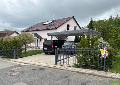 Straßenseitig befindet sich ein Carport für 2 PKW und der Haupteingang ins Erdgeschoss. Das Souterrain ist über einen separaten Eingang begehbar.