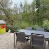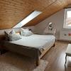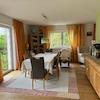 Erd- und Dachgeschoss bilden die Hauptwohnung. Man betritt die Wohnung und befindet sich in einer großzügigen Diele, von welcher man alle Räume des Erdgeschosses, sowie die anderen Etagen erreicht. Das Geschoss teilt sich in die Küche, Ess- und Wohnzimmer, sowie ein Gästezimmer und ein Gäste-WC. Küche, Ess und Wohnzimmer sind u-förmig angeordnet, sodass trotz der fehlenden räumlichen Trennung eine sichtbare und spürbare Unterteilung vorhanden ist. vom Essbereich sowie aus der Küche gelangt man auf die zur Wohnung zugeordnete, südwestlich am Haus angeordnete Terrasse.