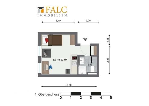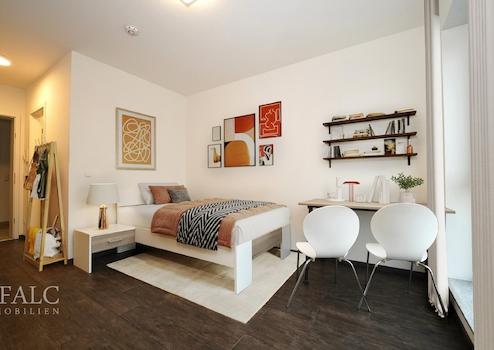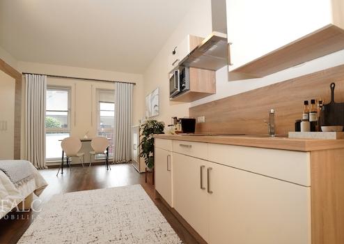 Das offene Wohn- und Schlafzimmer ist ideal für eine individuelle Gestaltung und lädt zum Entspannen ein. In der kleinen, aber funktionalen Küche finden Ihre Mieter alles, was sie für ein entspanntes Kochen brauchen: Stauraum, Kochstelle, Mikrowelle mit Backofenfunktion und eine Ablufthaube. Das Duschbad ist modern und zeitlos in Weiß gehalten.