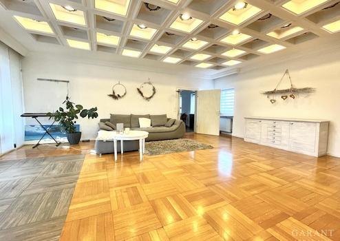 Auf ca. 175 qm Wohnfläche erwartet Sie ein außergewöhnlich ausgestattetes, ca. 45 qm großes Wohnzimmer mit offenem Kamin, eleganten Parkettböden und großen Fensterfronten, die einen atemberaubenden Blick über die Terrasse auf die Inzeller Berge bieten.