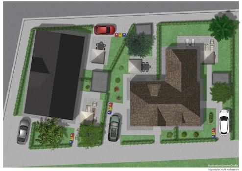 Terrasse Richtung Süd+West, jeweils ca. 15 qm, offener PKW-Stellplatz,