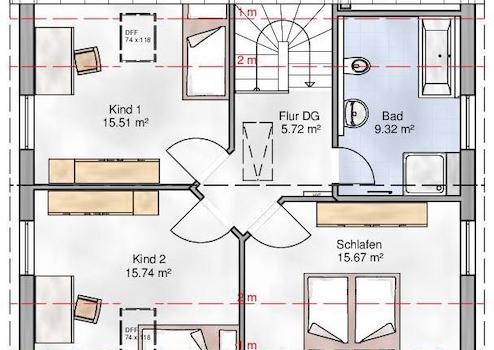 Im OG befinden sich zwei Kinderzimmer, das Elternschlafzimmer, das Bad mit WC und Badewanne, sowie der Flur mit Treppe zum EG