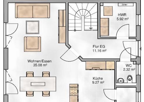 Im EG befinden sich das große Wohn/Ess-Zimmer, die Küche, der Hauswirtschaftsraum, das Gäste-WC und die Diele.