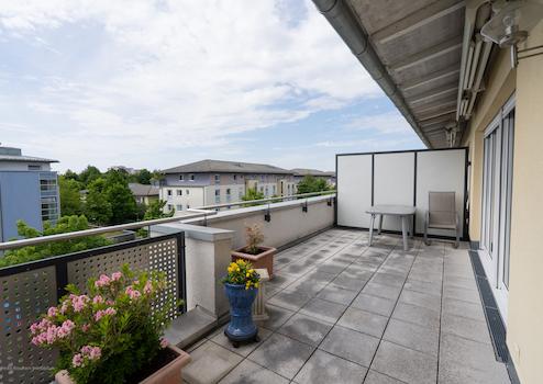 Der praktisch konzipierte Grundriss bietet eine Diele mit offener Küche, ein Wohnzimmer, ein Schlafzimmer, ein Kinderzimmer, ein Bad sowie eine Gäste-Toilette mit Fenster. Die großzügige Dachterrasse, welche vom Wohn- und Schlafzimmer aus zugänglich ist, lädt zum Entspannen und Verweilen ein. Die Westausrichtung sorgt für angenehme Sonnenstunden am Nachmittag und Abend – ideal für Berufstätige, die den Feierabend an warmen Sommertagen entspannt ausklingen lassen möchten.