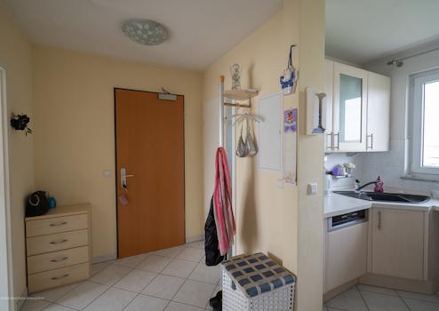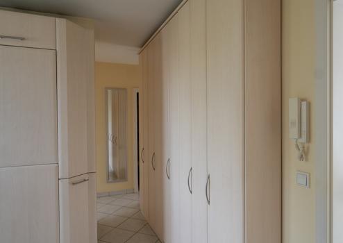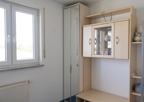 Zusätzlichen Stauraum bieten die in der Diele platzierten Einbauschränke, welche mit der Einbauküche farblich abgestimmt sind.