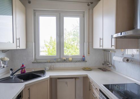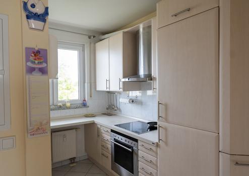 Die offene und lichtdurchflutete Küche lädt zum gemeinsamen Kochen und Verweilen ein. Die charmante U-förmige Einbauküche in hellem Holzdesign besticht durch ihre funktionale Ausstattung und bietet vielfältigen Stauraum. Zahlreiche E-Geräte wie z. B. Backofen, Herd mit Cerankochfeld, Geschirrspüler sowie eine Einbaukühl- und Gefrierkombination sind vorhanden. Einige Unterbau- und Hängeschränke bieten zudem ausreichend Platz für Küchenutensilien und Vorräte.