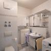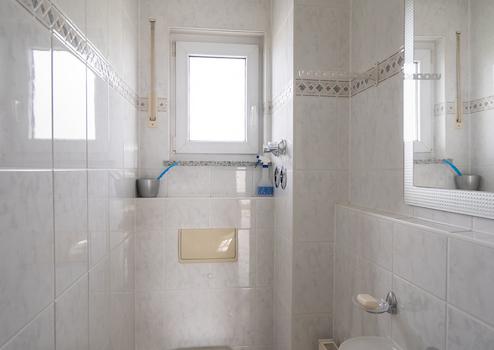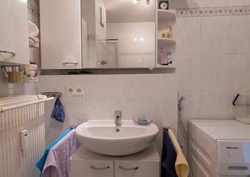 Das Bad ist ausgestattet mit einer Badewanne, einem Waschbecken mit Einhebelmischbatterie, einer Toilette und einem praktischen Stellplatz für die Waschmaschine. Die raumhohen, weiß-marmorierten Wandfliesen harmonieren perfekt mit den Bodenfliesen und verleihen dem Raum eine ruhige Atmosphäre. Das Gäste-WC ist farblich auf das Bad abgestimmt und verfügt ebenfalls über eine Toilette, ein Waschbecken mit Einhebelmischbatterie sowie ein Fenster, das für angenehmes Tageslicht sorgt.