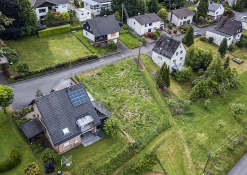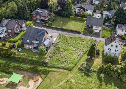 Das Grundstück in Steinebach/Sieg befindet sich in einem ruhigen und grünen Wohngebiet am Ende einer Sackgasse, direkt vor dem Wendehammer. Es liegt auf einer Anhöhe und bietet einen schönen Fernblick. Die Umgebung zeichnet sich durch eine ländliche Idylle mit angrenzenden Wiesen und Feldern aus.