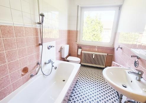 Die Wohnung verfügt über 2 Zimmer in einer schönen Raumaufteilung. Das Badezimmer mit seinen rosa Fliesen ist top gepflegt und wird schon wieder modern.
