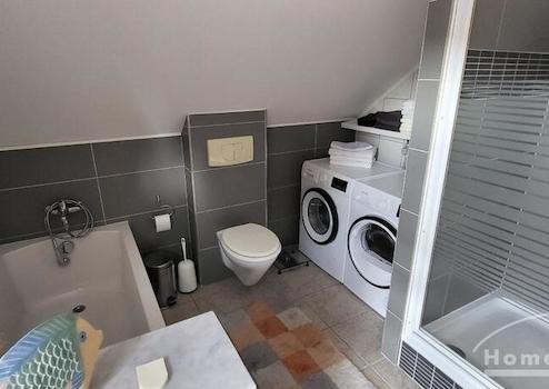 Das helle Badezimmer verfügt über ein Fenster, das für Tageslicht und gute Belüftung sorgt. Es ist ausgestattet mit einer komfortablen Badewanne, einer separaten Dusche, einem Waschtisch mit Spiegel sowie modernen Armaturen. Waschmaschine und Trockner stehen hier zu Verfügung.