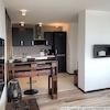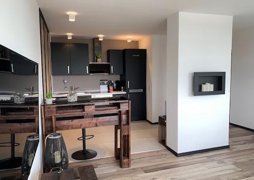 Als Esstisch fungiert eine Holztheke mit Sitzhockern. Dahinter befindet sich die gut ausgestattete Einbauküche.