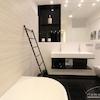 Badezimmer: ein Badezimmer mit Badewanne, Doppelwaschbecken und WC. Ein weiteres Badezimmer mit großer Dusche, Waschbecken und WC.