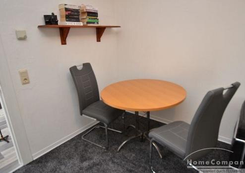 Diese Wohnung ist Teil eines Zweifamilienhauses in Bremerhaven-Lehe. Versteckt hinter einer Mauer und damit abgeschirmt von der Geräuschkulisse der Stadt befindet sich das charmante Zweifamilienhaus. Die Wohnung verfügt über einen separaten Zugang. Die Wohnung selbst befindet sich im ersten Obergeschoß des Hauses. Das Schlafzimmer der Wohnung ist ausgestattet mit einem Doppelbett und großem Kleiderschrank. Es befindet sich innerhalb der Wohnung auf der Strassen abgewandten Seite und gewährleistet damit einen ungestörten Schlaf. Das anschliessende Badezimmer ist mit einer Badewanne versehen. Vom Badezimmer ausgehen haben sie einen Zugang zum Dachboden und und dem sich darin befindlichen Trockenraum für die Wäsche. Die Wohnung wurde nach umfänglicher Renovierung komplett neu ausgestattet. Das Wohnzimmer und das Arbeitszimmer sind mit einem angenehmen, modernen Hochflorteppich versehen. Alle Wände sind in neutralem Weiß gehalten. Das Inventar von Wohn-und Arbeitszimmer umfasst helle Holztöne gepaart mit dunklem Leder. In der Küche befindet sich eine helle neue Einbauküche mit Backofen, Herd mit Ceranfeld und Mikrowelle sowie Kühlschrank. Ein erhöhter Barbereich ermöglicht es Ihnen auch in der Küche zu essen. Die Wohnung ist perfekt für eine Person oder ein Paar. Handtücher und Bettwäsche werden gestellt. Der Mietpreis versteht sich als Pauschalmiete inklusiv aller Nebenkosten. Diese Nebenkosten sind auf der Basis eines Durchschnittsverbrauchs gedeckelt. Eventueller Mehrverbrauch wird individuell nachberechnet.