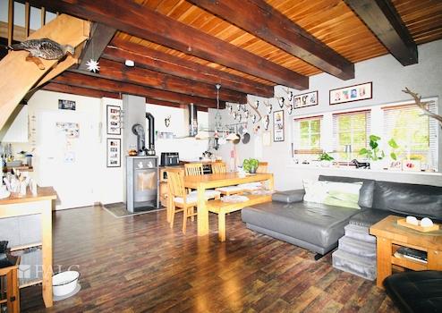 Das Herzstück des 1997 erbauten Hauses, die große Hauptwohnung mit einer Größe von 144 m² und der offenen Gestaltung bietet viel Platz für gesellige Abende und entspannte Stunden. Große Fensterfronten sorgen für eine helle und freundliche Atmosphäre und gewähren einen wunderbaren Blick in den Garten.