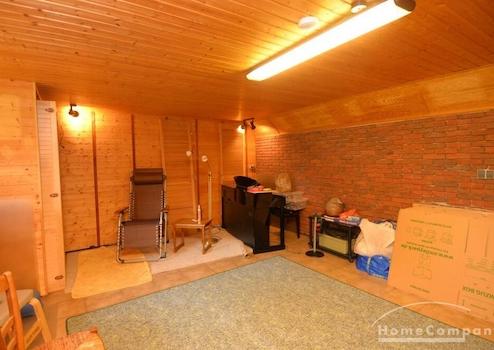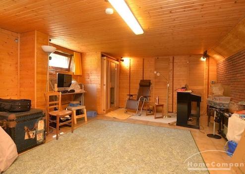 zusätzlicher Hobbyraum mit Kicker und Infrarot-Sauna. Ein heller Wohnbereich mit Zugang zur Terrasse und dem Garten mit der Garage.