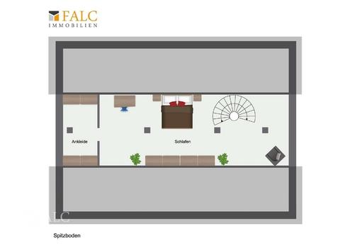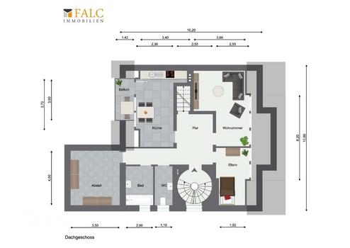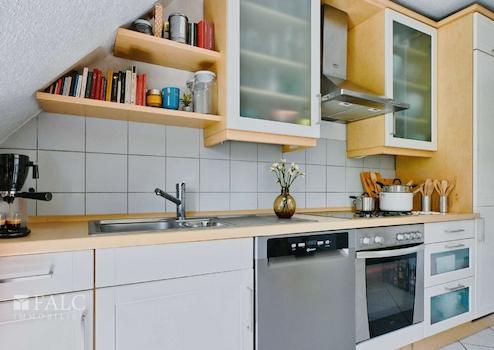 Die gemütliche Maisonettewohnung im Dachgeschoss und Spitzboden erstreckt sich über ca. 85 m² und besticht durch ihr besonderes Wohnambiente. Im unteren Bereich befinden sich die Küche mit Zugang zum Balkon, ein Wohnbereich sowie ein Arbeitszimmer. Zudem gibt es ein weiteres Zimmer das als großer Abstellraum genutzt wird. Über eine Treppe gelangt man ins Dachgeschoss, wo sich der großzügige Schlafbereich mit integrierter Ankleide befindet.
