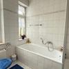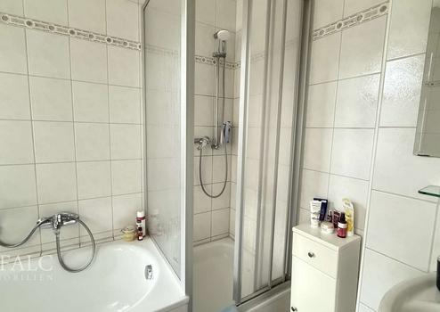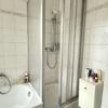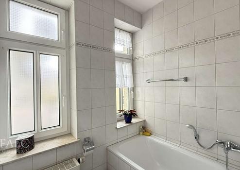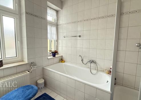 Das Badezimmer ist mit einer Badewanne und einer separaten Dusche ausgestattet, was für zusätzlichen Komfort sorgt. Die hellen Fliesen und das Fenster verleihen dem Raum eine frische saubere Atmosphäre.
