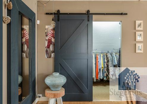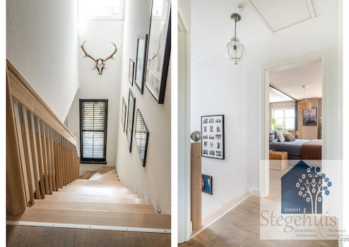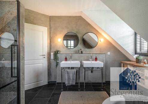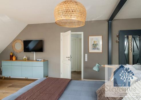 Flur mit Zugang zu zwei Schlafzimmern (vorher drei, kann mit geringem Aufwand wieder in drei Schlafzimmer umgewandelt werden). Das große Elternschlafzimmer verfügt über einen begehbaren Kleiderschrank mit Schiebetüren. Das Badezimmer ist ausgestattet mit Doppelwaschtischen, Toilette, freistehender Wanne und ebenerdiger Dusche. Das Badezimmer hat ebenfalls Fußbodenheizung und einen Designheizkörper. Im Flur befindet sich ein Abstellraum, in dem die Wärmepumpe installiert ist. Außerdem gibt es im Flur eine ausziehbare Treppe zum Dachboden.