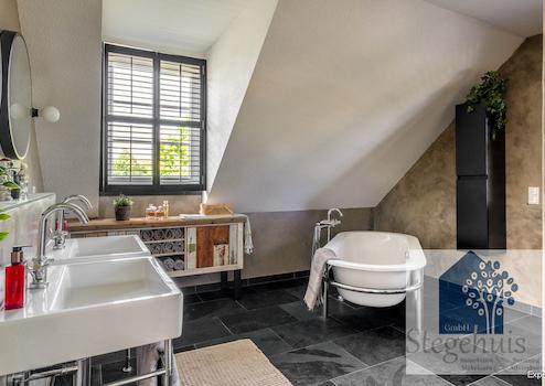 Dieses massive und luxuriöse englische Wohnhaus befindet sich in absolut ruhiger Top-Lage am Wasser der Schieferkuhle in Gronau. Die komplette Außenanlage ist im Stil des Hauses gestaltet, mit Taxushecken und großen Terrassenüberdachungen. Das Haus verfügt über eine Garage mit elektrischem Garagentor. Es wurde innen wie außen nur mit hochwertigen Materialien erbaut.