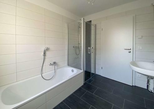 Das helle Tageslichtbad ist mit Badewanne und ebenerdiger Dusche ausgestattet und sorgt für maximalen Komfort. Ein praktischer Hauswirtschaftsraum schafft zusätzlichen Stauraum sowie Platz für Waschmaschine und Trockner.