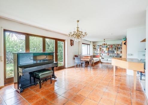 Im Erdgeschoss erwartet Sie der einladende Eingangsbereich mit Garderobe, Gäste-Toilette und offenem Treppenhaus. Das großzügige, lichtdurchflutete Wohn- und Esszimmer ist ein Highlight und lässt sich bei Bedarf in zwei separate Räume unterteilen. Durch die vielen Fensterfronten genießen Sie nicht nur einen wunderbaren Ausblick ins Grüne, sondern haben auch direkten Zugang zur Terrasse. Der sonnige Garten lädt zum Entspannen und Garteln ein. Die angrenzende Küche ist aktuell mit einer zweizeiligen Einbauküche ausgestattet und bietet Potenzial für eine offene, moderne Raumgestaltung.