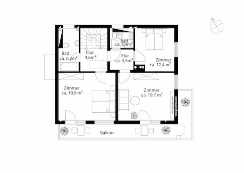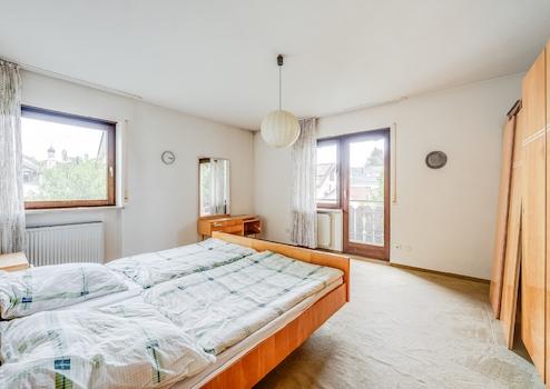 Das Obergeschoss umfasst zwei geräumige Schlafzimmer, die jeweils Zugang zu einem großzügigen, überdachten Balkon haben. Zudem gibt es ein weiteres Zimmer, das ideal als Kinder- oder Arbeitszimmer genutzt werden kann. Im Obergeschoss befinden sich zwei Tageslicht-Badezimmer - eines mit Dusche, eines mit Wanne. Besonders hervorzuheben ist die Möglichkeit, einen Teil des Obergeschosses als Einliegerwohnung zu nutzen.