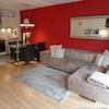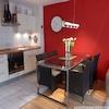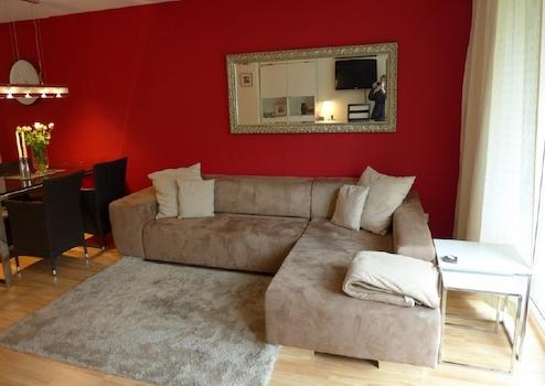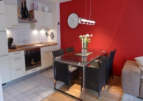 Das geschmackvoll eingerichtete Wohnzimmer mit Sitz- und Essbereich, sowie einer gut ausgestatteten, integrierten Einbauküche, erzeugt ein großzügiges Wohngefühl.