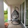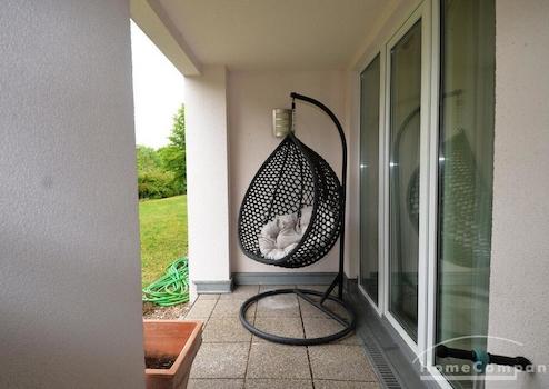 Ein besonderes Highlight ist die Terrasse mit Balkonbereich, auf der ein bequemer Schaukelstuhl zum Verweilen einlädt. Der Eingangsbereich bietet zusätzlichen Stauraum dank eines praktischen Schuhschranks.