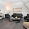 Im Wohnzimmer erwarten Sie exklusive Ledersitzmöbel, stilvolle Lichtgeber sowie ein 65" Sony Smart-TV.
