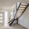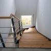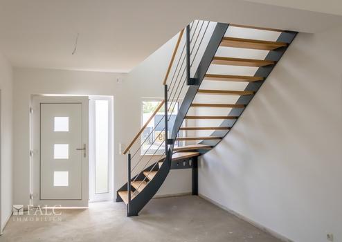 Durch den Erker auf der Eingangsseite betritt man die großzügige Diele von der aus man über eine moderne, viertelgewendelte Stahlwangentreppe mit Holztrittstufen ins Dachgeschoss gelangt.