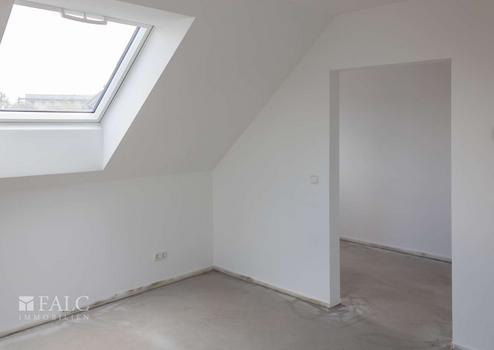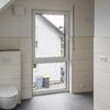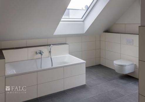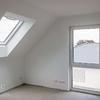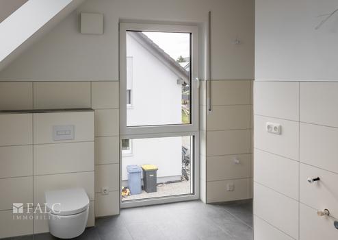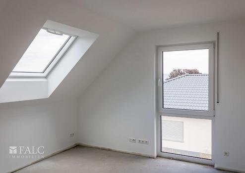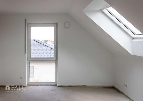 Im Dachgeschoss, mit einer Drempelhöhe von einem Meter, befinden sich weitere vier Zimmer und ein großzügiges Bad mit Wanne und bodengleich gefliester Dusche. Alle Räume haben ein zusätzliches großes Dachfenster, wodurch auch hier ein helles und angenehmes Wohngefühl entsteht. Die Wohnraumfenster sind mit manuell zu bedienenden Rollläden ausgestattet. Im Giebel haben die Fenster ein festverglastes Unterteil, was vor allem in den Kinderzimmern eine gewisse Sicherheit bietet.