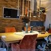 - das Wohnzimmer mit teilweise verklinkerter Wand und dekorativem Pellets-Kaminofen